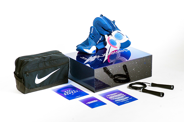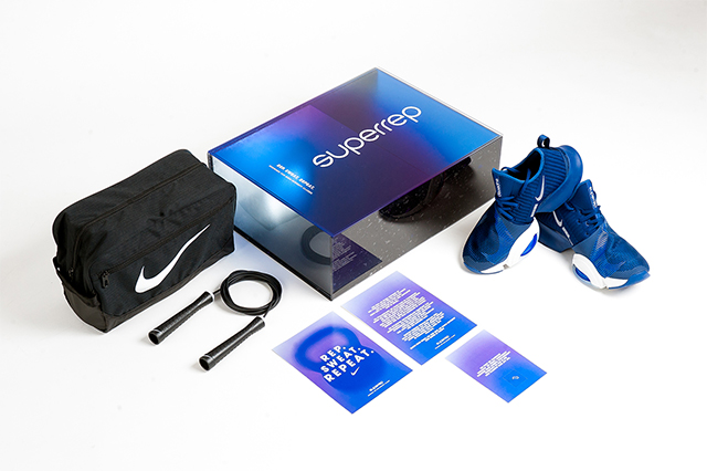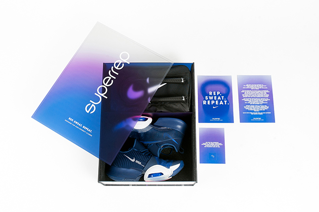 Die Besonderheit der Box liegt am haptischen und optischen Design. Die milchigen Acrylseiten wurden passend im Colorway des Schuhs designt und gaben einen Sneak Peak auf die innovative Schuhsohle. Die gesamte Seeding Box wird durch ein gebrandetes praktisches Klettverschlussband zusammengehalten. Die Innenfläche besteht aus einem Fitnessboden-Material, die die natürliche Umgebung des Schuhs, im Gym widerspiegelt. Beim Abnehmen des Deckels gelangt man zunächst an die personalisierte Begrüßungskarte im selben Farbverlauf-Design und zu mehr Produktinformationen durch einen QR Code. Die Box ist in zwei Bereiche unterteilt. In dem größeren Teil befindet sich der SuperRep. In dem Fach daneben, befindet sich eine gebrandete Schuhtasche mit der neusten Nike Trainings Kollektion, sowie ein Springseil & Sliding Disk.
