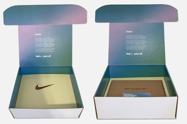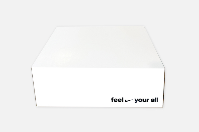 Für das Kit haben wir eine Seeding Box passend zur Kampagne entworfen, um das Motto “Feel your all” widerzuspiegeln. Die Box wurde von außen schlicht in Weiß mit einem kleinen Branding gehalten, da sie gleichzeitig auch als Versandbox diente. Als Kontrast erstrahlen die Kampagnenfarben nach dem Öffnen der Box. Das Kit ist in zwei Ebenen durch einen Zuschnitt mit Swoosh Aussparung unterteilt und bietet somit weitere Surprise Momente beim Entdecken. Auf der oberen Ebene befinden sich die Goodies, die durch extra angefertigte Vertiefungen perfekt platziert sind. Mit Hilfe von Schlaufen gelangt man zur unteren Ebene, bei dem noch weitere Produkte aus der Trainingskollektion integriert wurden.