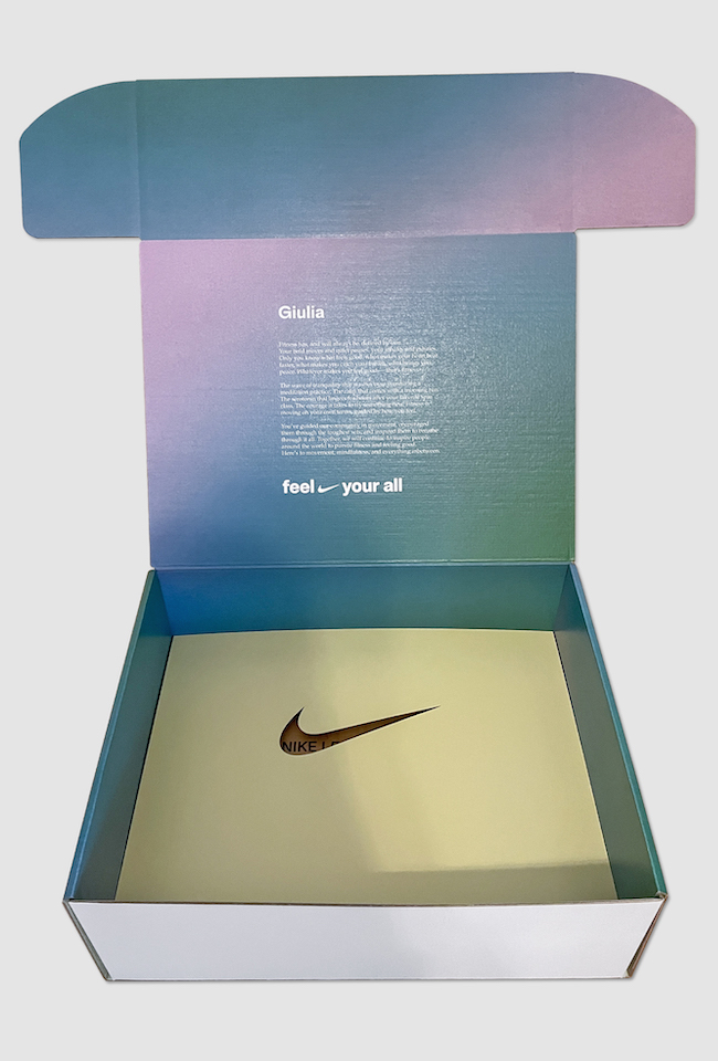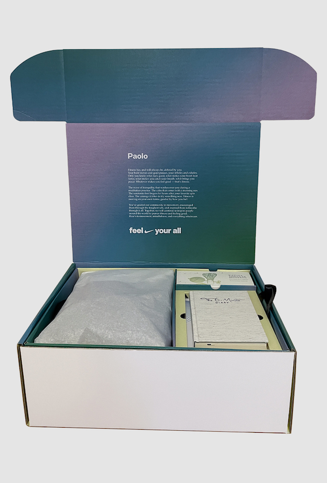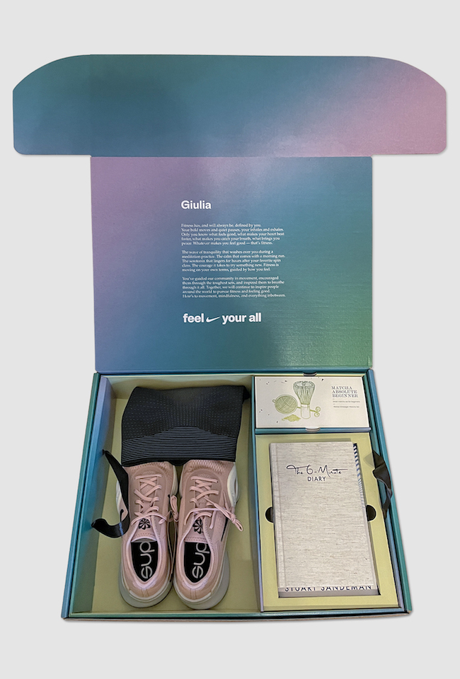 Im Jahr 2023 startete Nike seine neue Kampagne ´Future Fitness`. Der Fokus war Bewegung und Achtsamkeit in den Einklang zu bringen, um sich gut zu fühlen. Für die internationalen Coaches und Trainer Community von Nike wurden wir beauftragt den neuen Fitness Fokus durch ein Feel Good Kit gekonnt in Szene zu setzen. Neben der neuen Nike Trainingskollektion erhielten alle auch ein 6-Minute-Journal, ein Matcha Starter Set und ein Buch zur richtigen Atemtechnik.