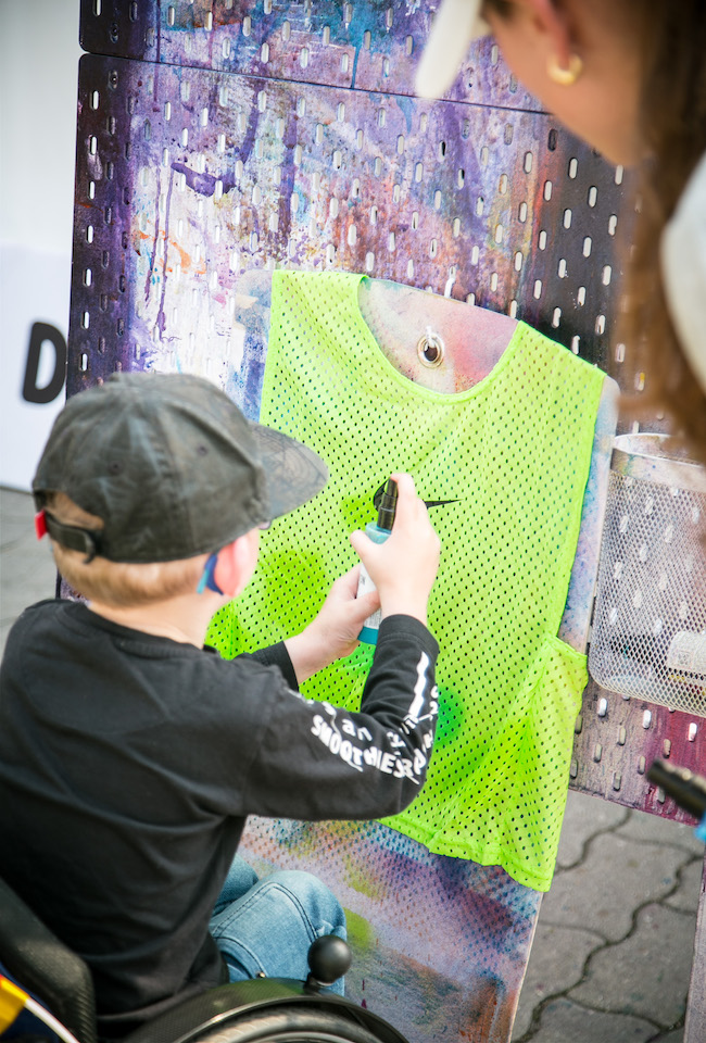 Die Besucher*innen verschiedenster Nationalitäten, mit und ohne Behinderung, konnten sich während des Open Plays an Tischtennis, Cornhole, Trampolin springen und der Fußballwand versuchen. Als Belohnung für die Teilnahme, durften sich alle Gäste ein Leibchen mit nach Hause nehmen, dass sie noch vor Ort selbst mit Textilfarbe customizen konnten.